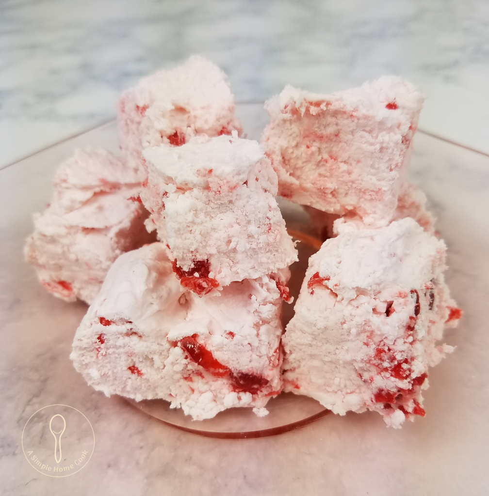 Unlike most of the divinity my paternal grandmother made (and she made tons of divinity), this divinity is normally poured into a lightly buttered pan/dish and cut like fudge. This was my mom’s favorite way to make divinity. However, I believe it could be dropped by spoonfuls on wax paper like other divinity instead. However, you would have to work really fast as the addition of cherries cools down the mixture faster and makes it more difficult to drop. I will just stick to treating it like fudge instead.